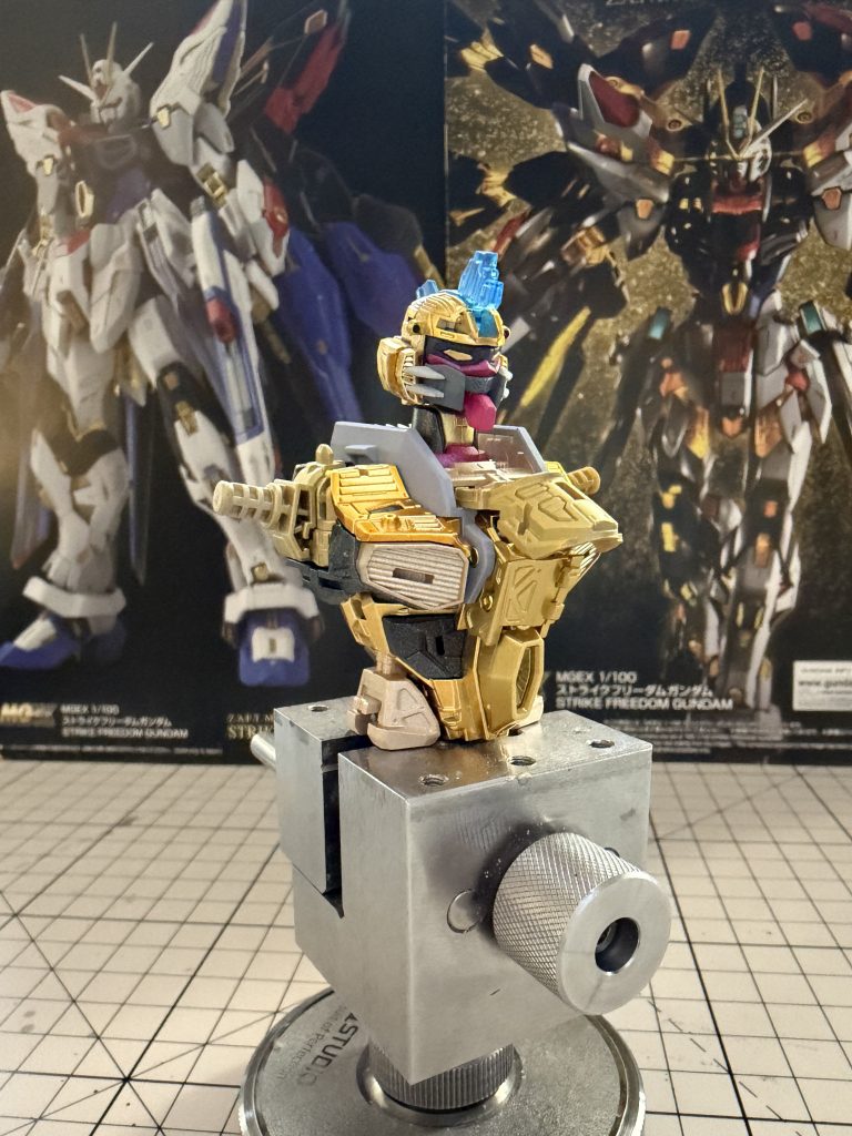 MGEXストライクフリーダムを作っていますが、HGみたいに「一度全部仮組みしてからバラして塗装」というのが難しいですね。特にゴールドの積層フレームは、一度バラすとバラバラに崩れてしまうので、結局、少しずつ組み立てながら塗装する形にしました。