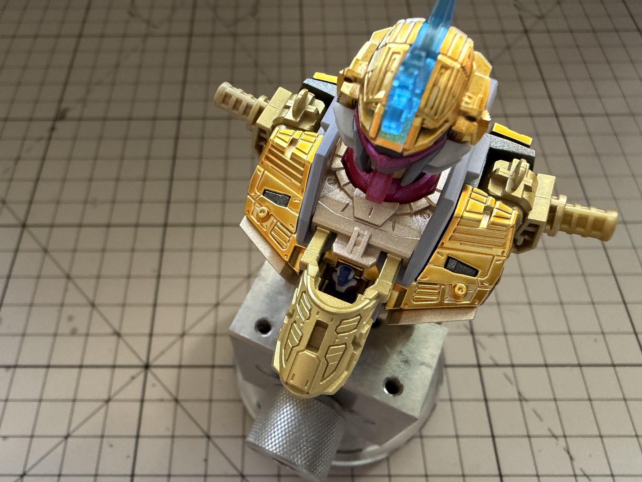 メッキパーツを剥がして合わせ目やゲート処理をしようかとも考えたのですが、自分ではこれほど輝くゴールドを吹く自信がなかったので断念しました。銅色のパーツはメッキを落としてシャンパンゴールドに塗り替え。ゴールド部分はHSM-02を使っていますが、やっぱりラッカー系の発色には敵いませんね…。でもラッカーは塗装ブースを使っていてもどうしても臭いが残ってしまい、家族に不評なので我慢です。