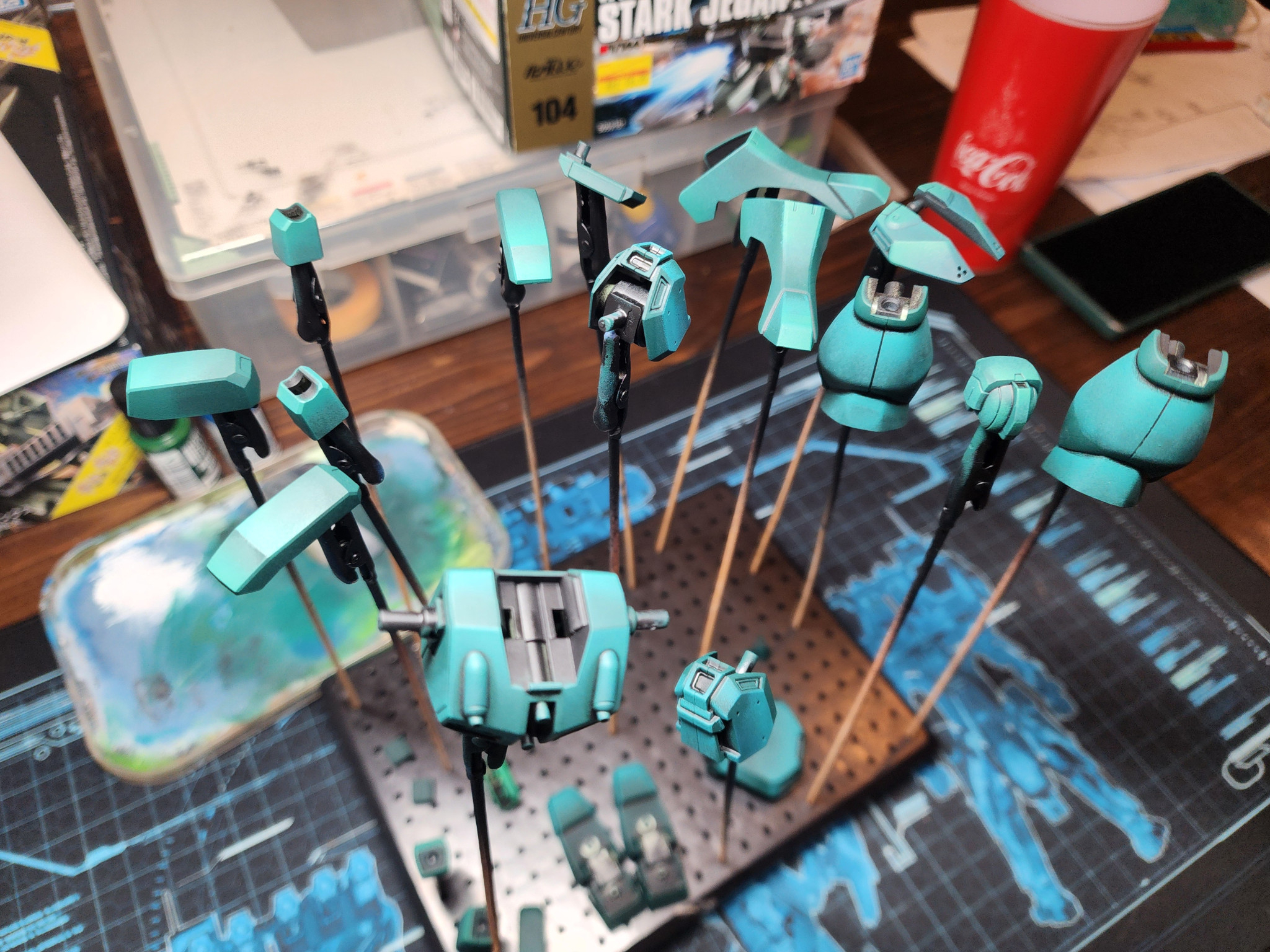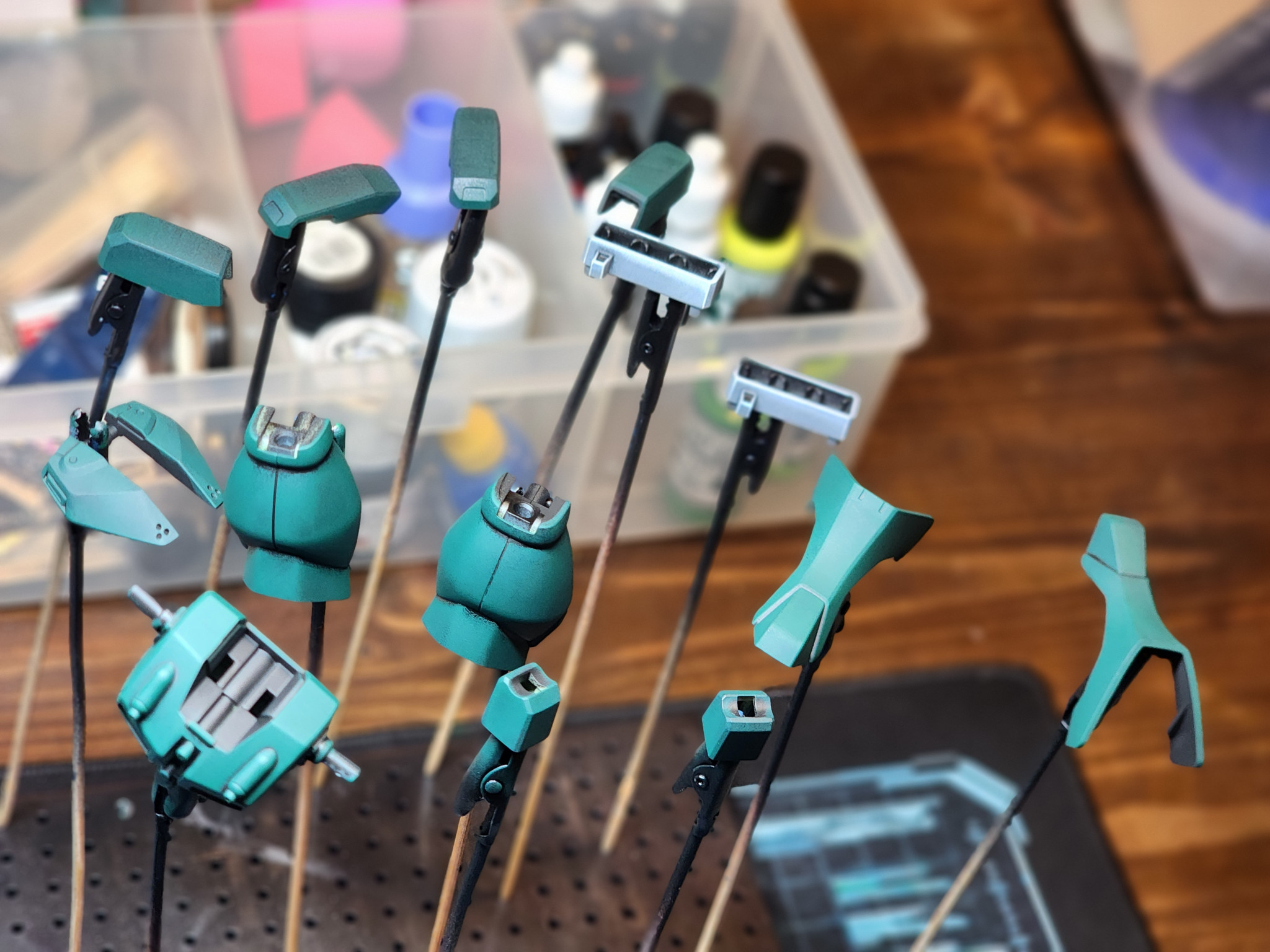 自分で色を調合することにしたのですが、当初のカラーモックアップから少しずれてしまいました。全体的に、本来の色よりも青みがかったターコイズブルーになってしまいました。うっかり…まあ、これは「カラーガイド」と呼ぶしかないでしょう。