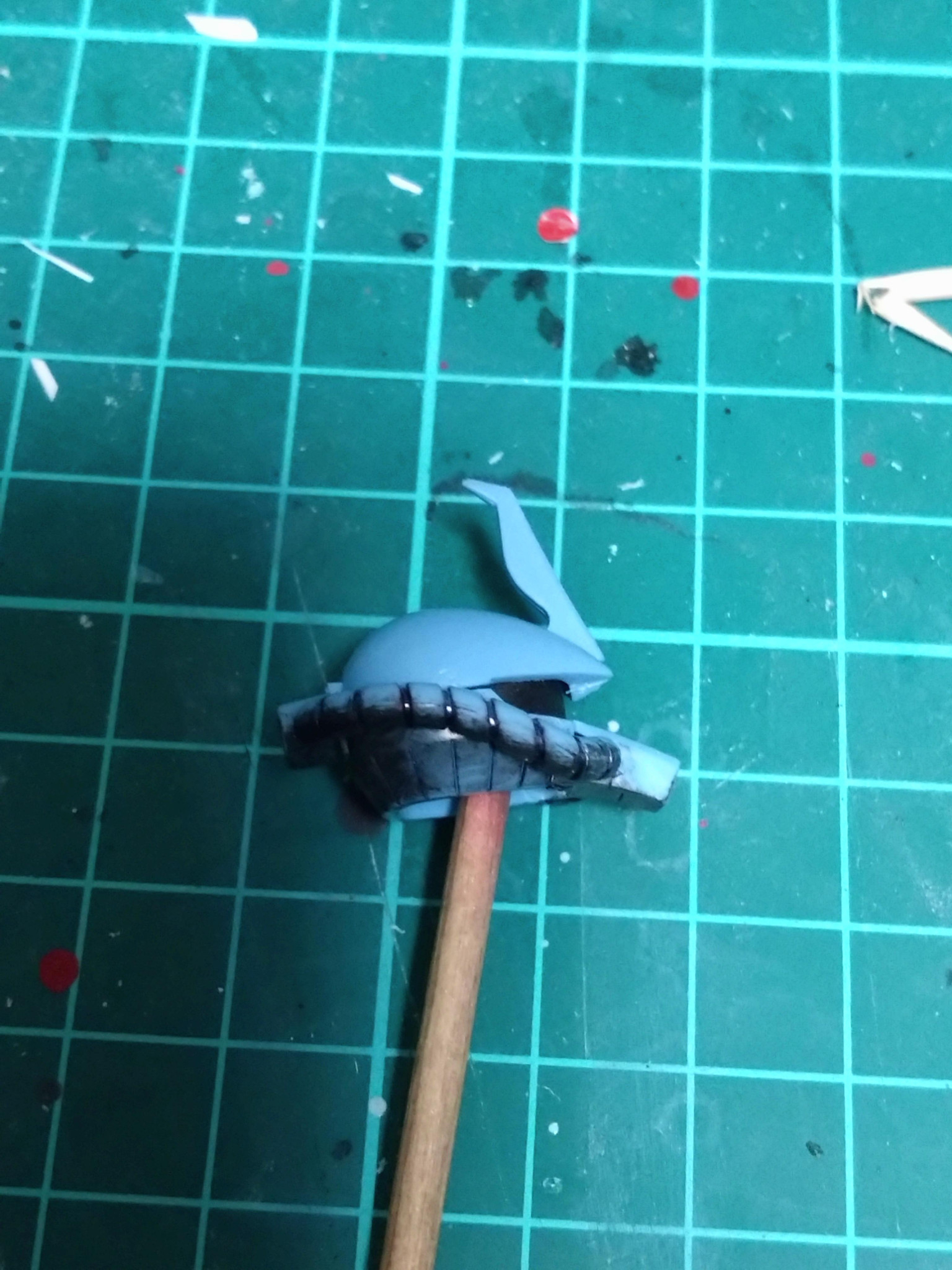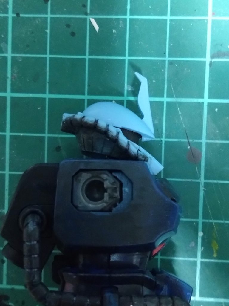 横から見るとわかりますが普通の改造はひさし部分を細めて悪っぽさを制作するのをよく見てましたが私は逆に頭の後の部分を削ってモノアイ周りのひさし部分の幅を少し広がるようにしてみました。