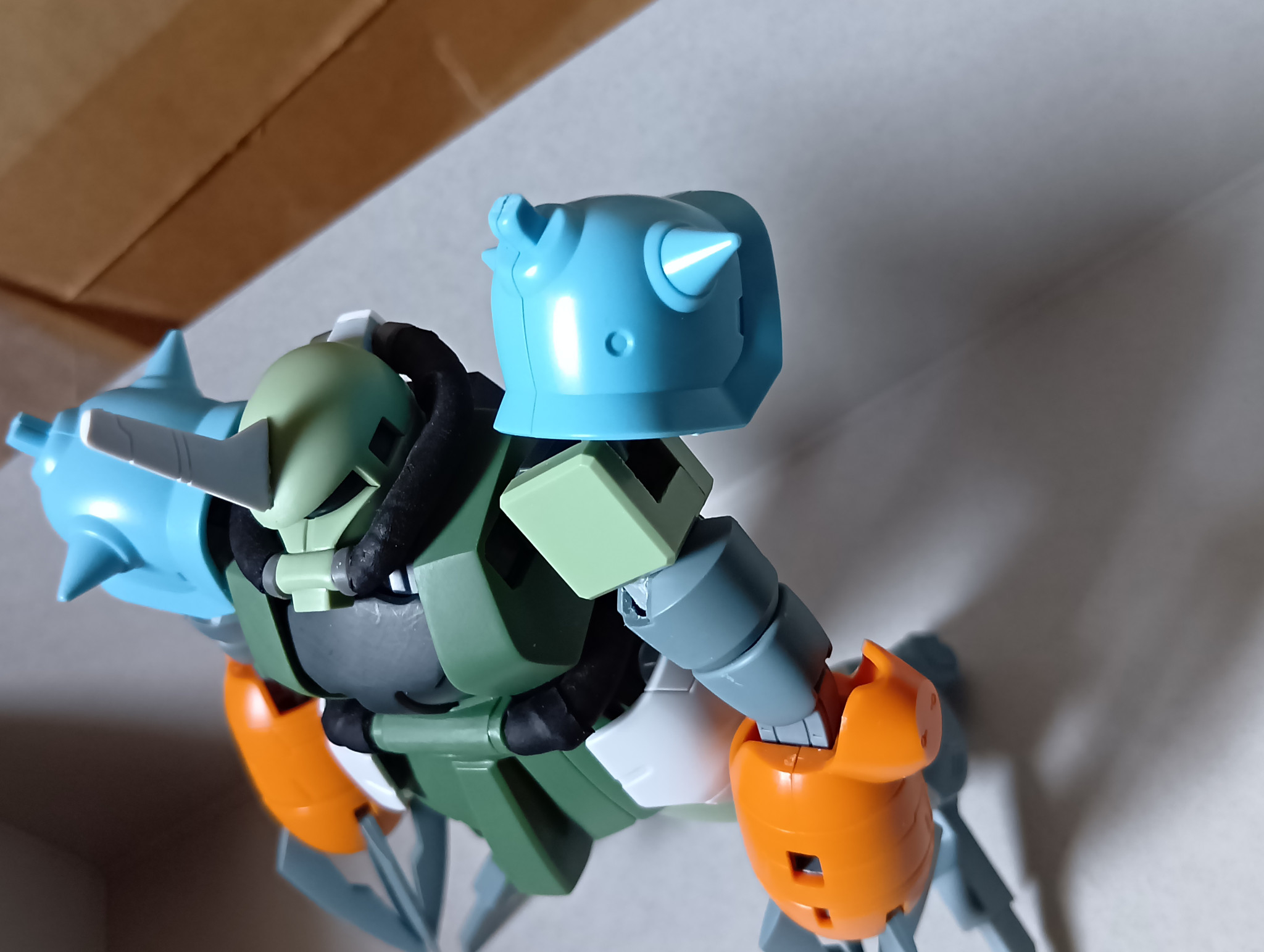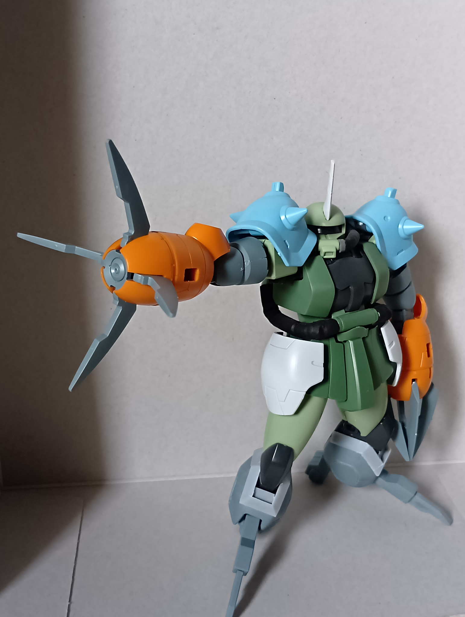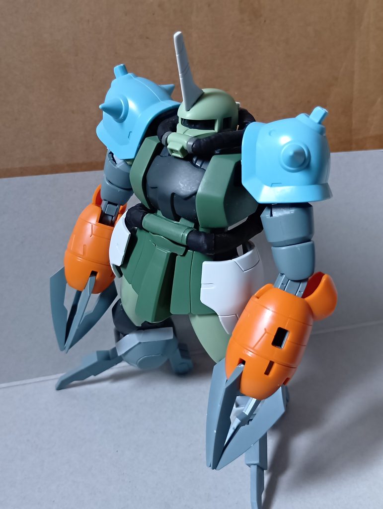 スカートもつけて、ロディのサイドスカートを盛ってみると、うーん普通の水中用ザク風、肩に昔イエサブで腕だけで買ったグフカスのショルダーを…完全に思ってたのと違うものに😅