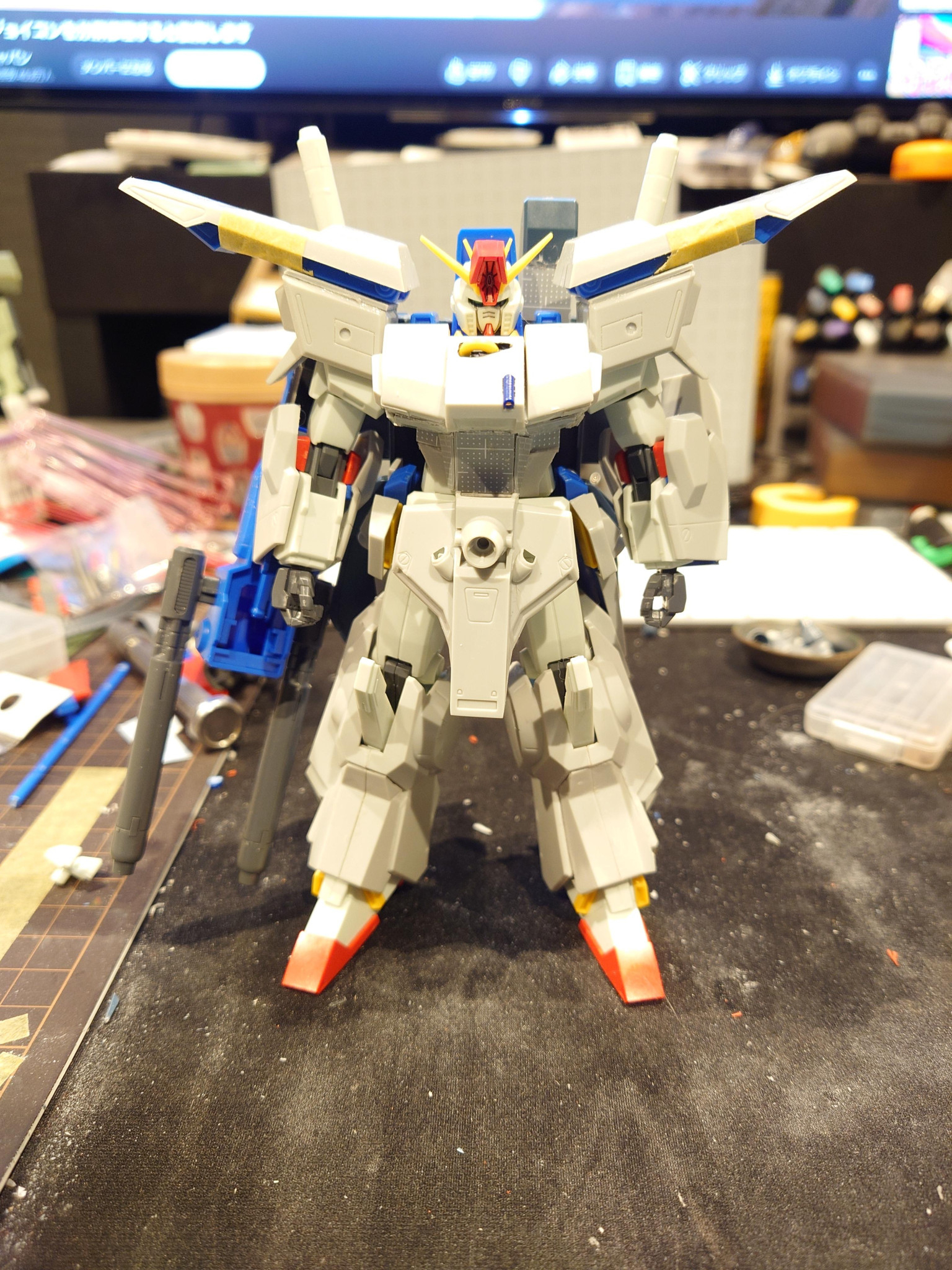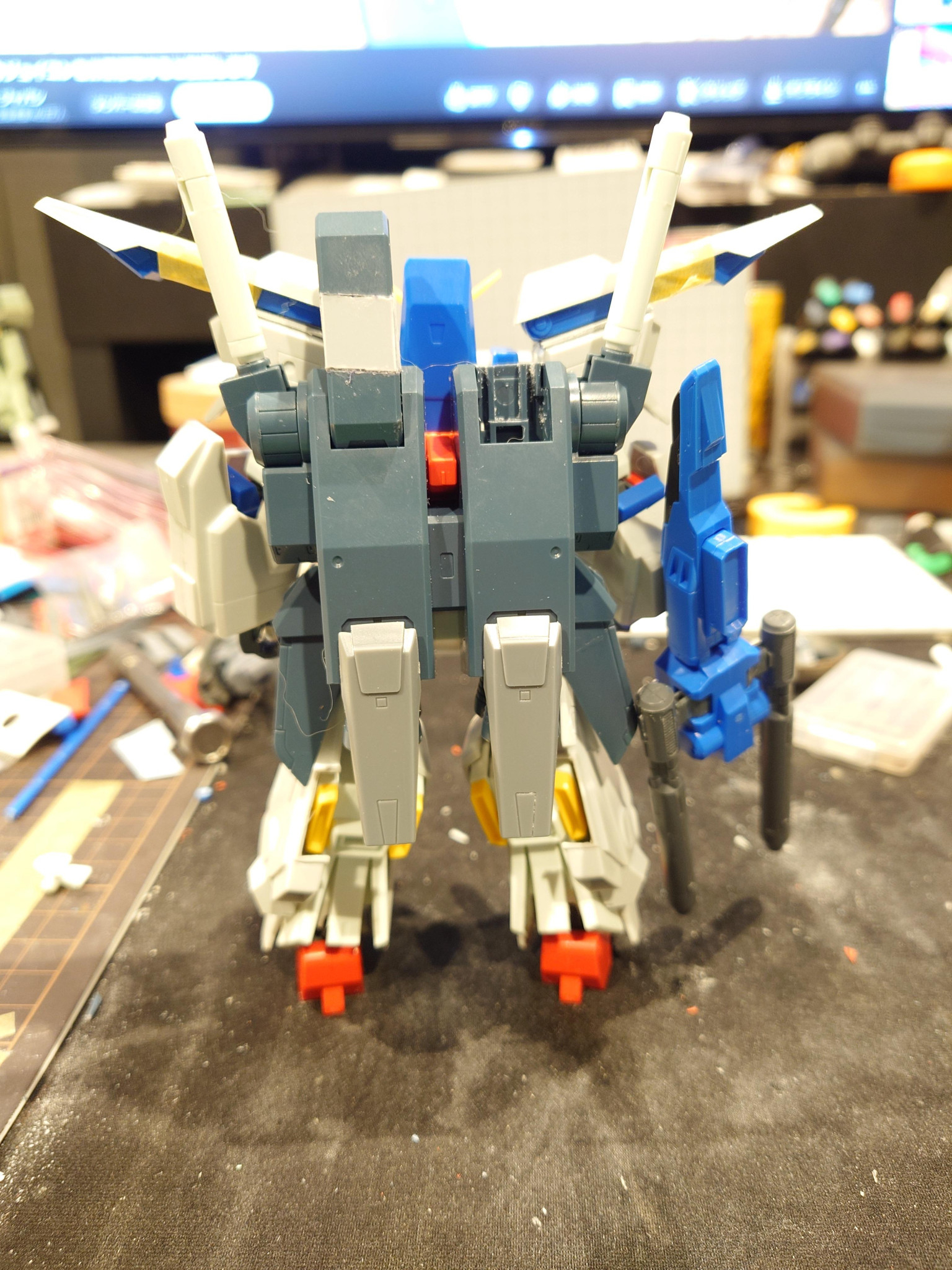 最初結構簡単にできそうだなって思いましたが、加工が大変で、アーマーもパージできるようにネオジム磁石仕込んだり、足のアーマー少し横幅の間隔詰めたり、バックパックの延長と肩バインダー?を最初旧キットのバインダーを重ねたりしましたがなんか分厚なりすぎたので、元のZZバインダーを延長して作成しました、ただ写真撮り忘れましたが(泣)
