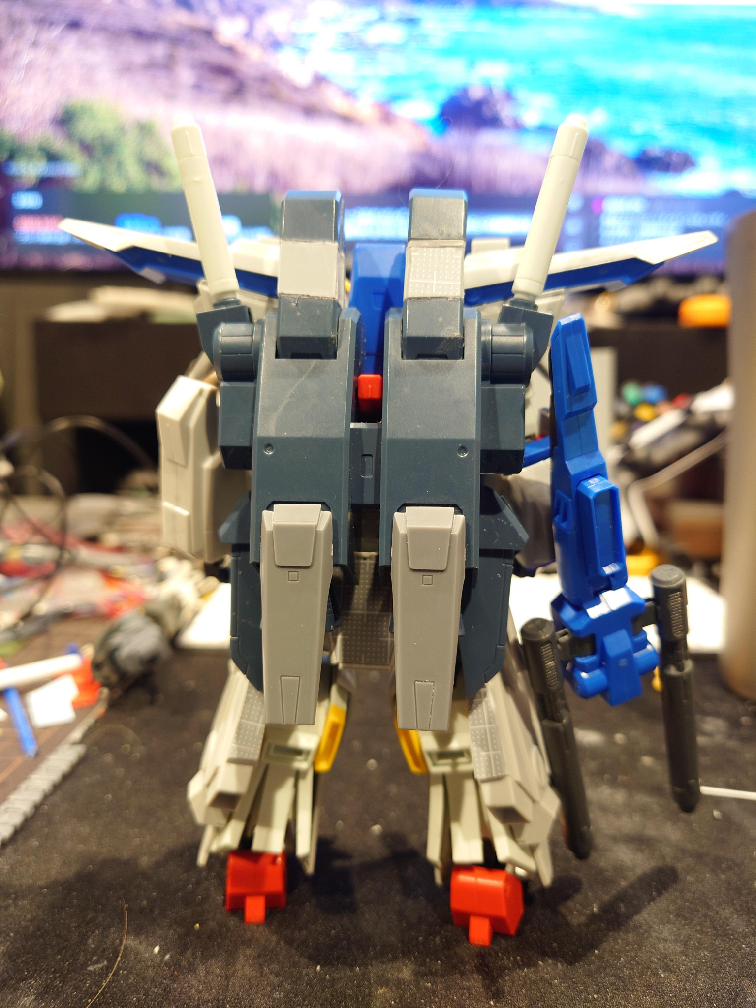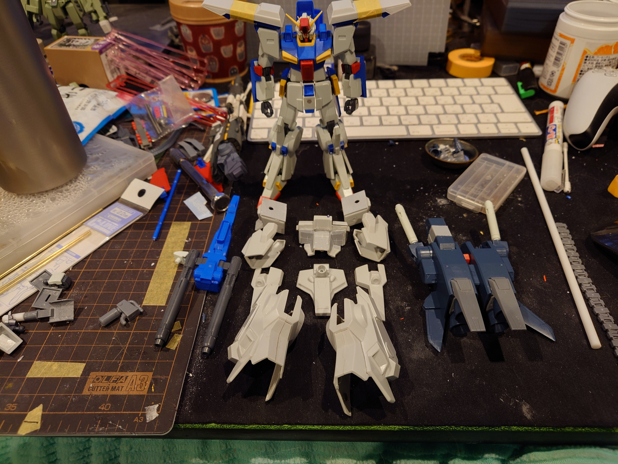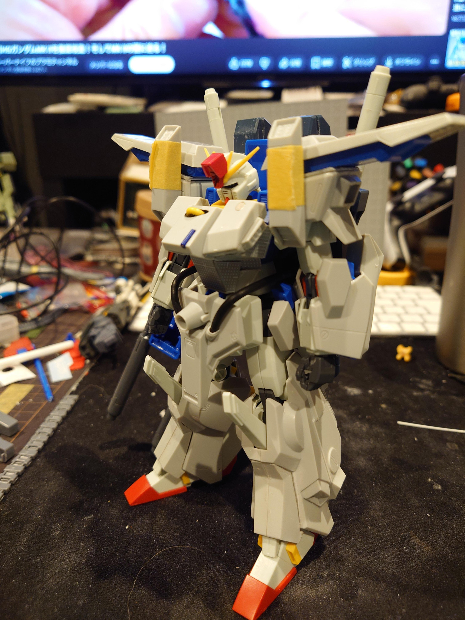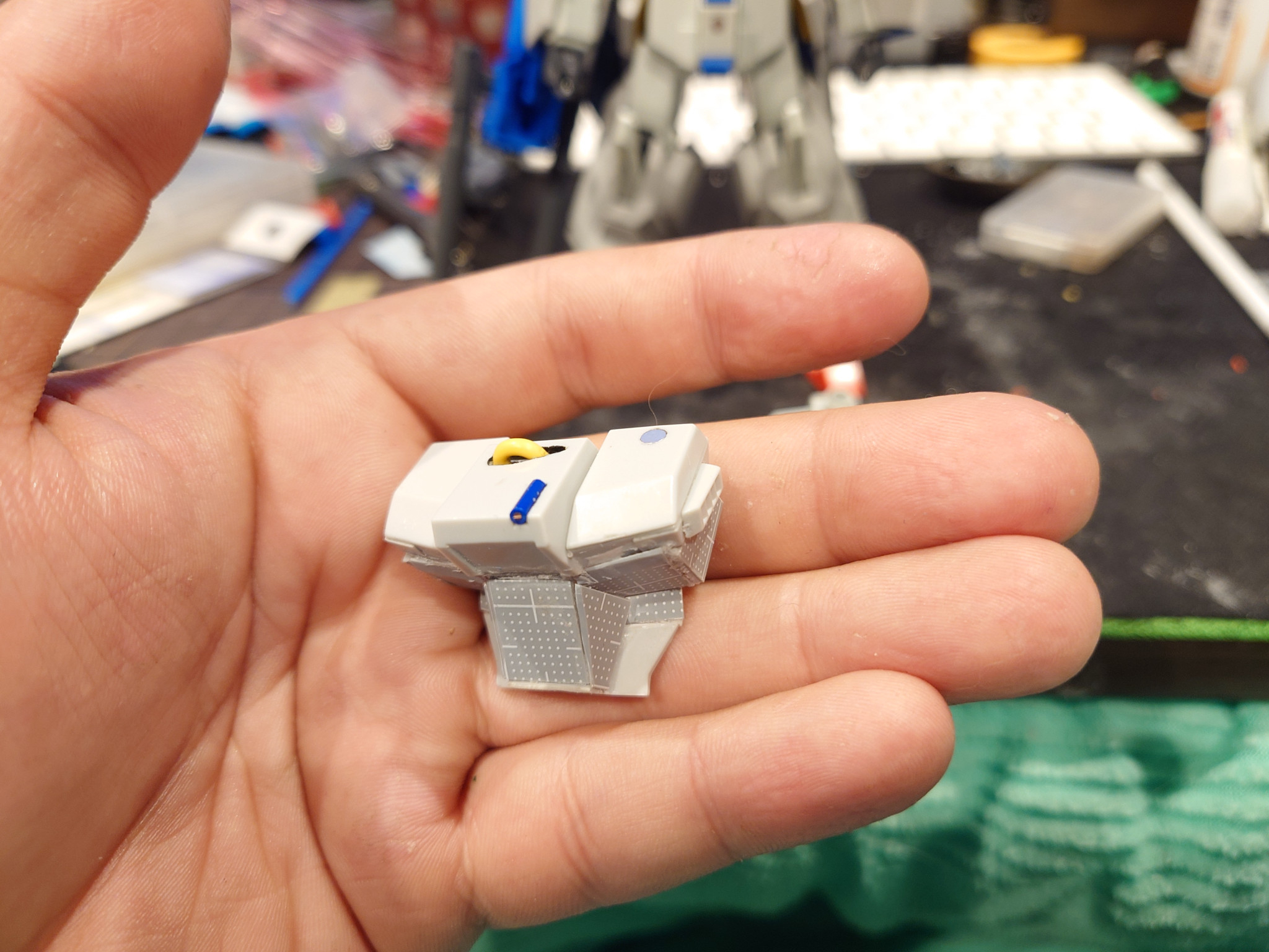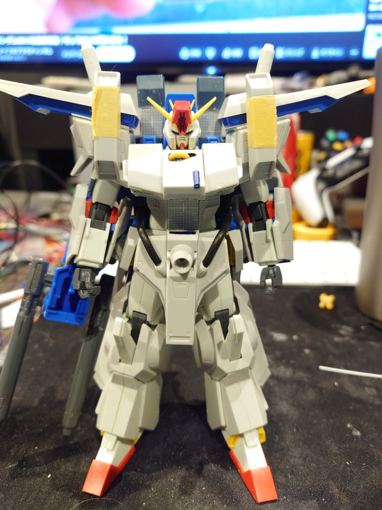 胴体のアーマーが一番しっくりこなくて、胴体に合わせてプラ版で作成ししてみました。後分かりにくいですが、zzのヘッドも少し加工してます。フェイスパーツの短縮加工約1mm、ハイメガキャノンのところはランナー使用して延長加工してみました。