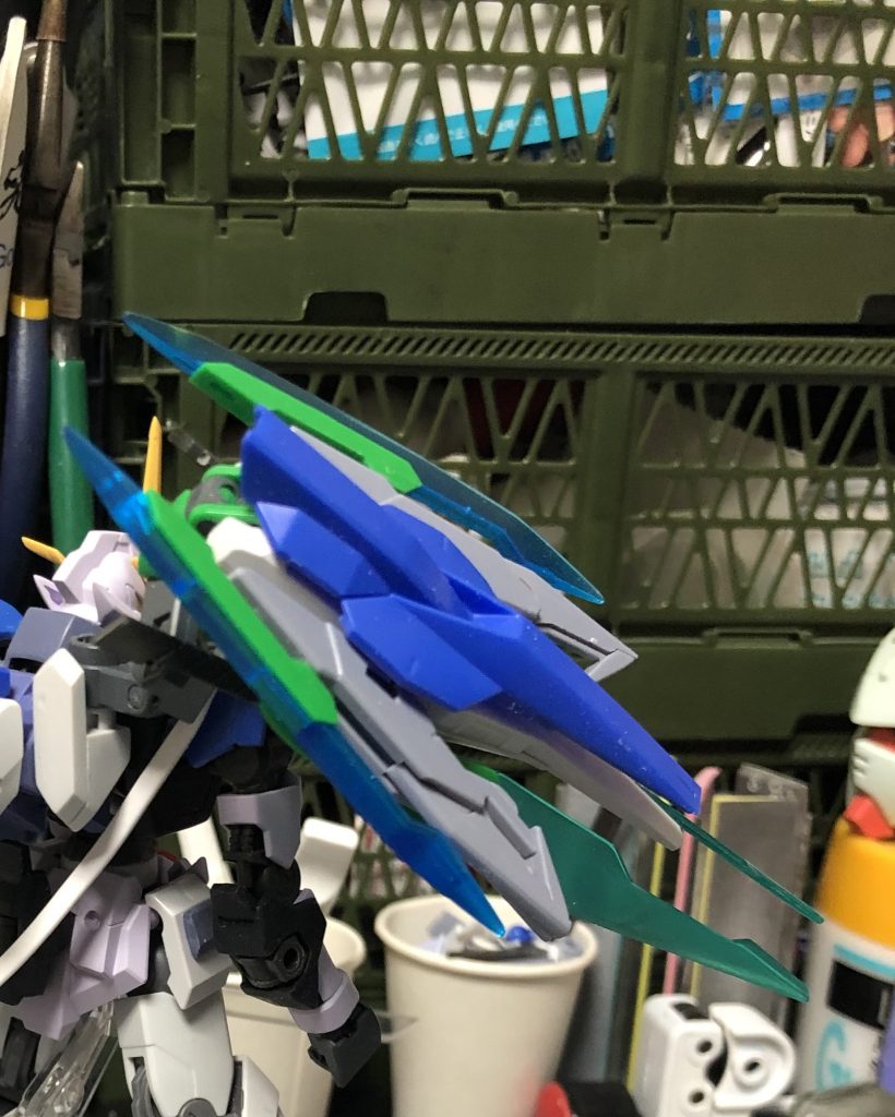 下部の双剣はもうちょっと単純で、Fファンネルのブレードが接続できる程度にパーツをカット。シアクアンタの接続を活かす形で、更にブレードとバインダーが干渉しない角度で貼ってから接続の隙間をパテ埋めしてます。
