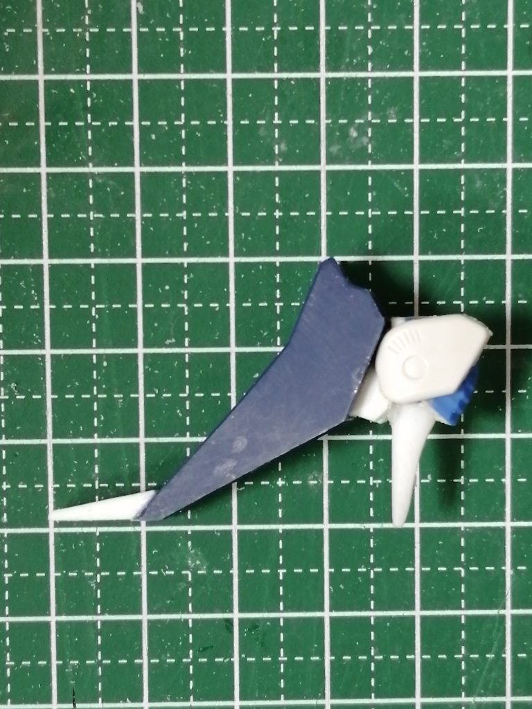 爪先パーツと踵パーツがそのままでは付かないため、クサビ形のパーツをプラ板で作成。いかにも自作パーツですという雰囲気を無くすために直角部分を減らしたのですが、組み付けたらほとんど見えなくなるじゃねーか!がっかりですわ。