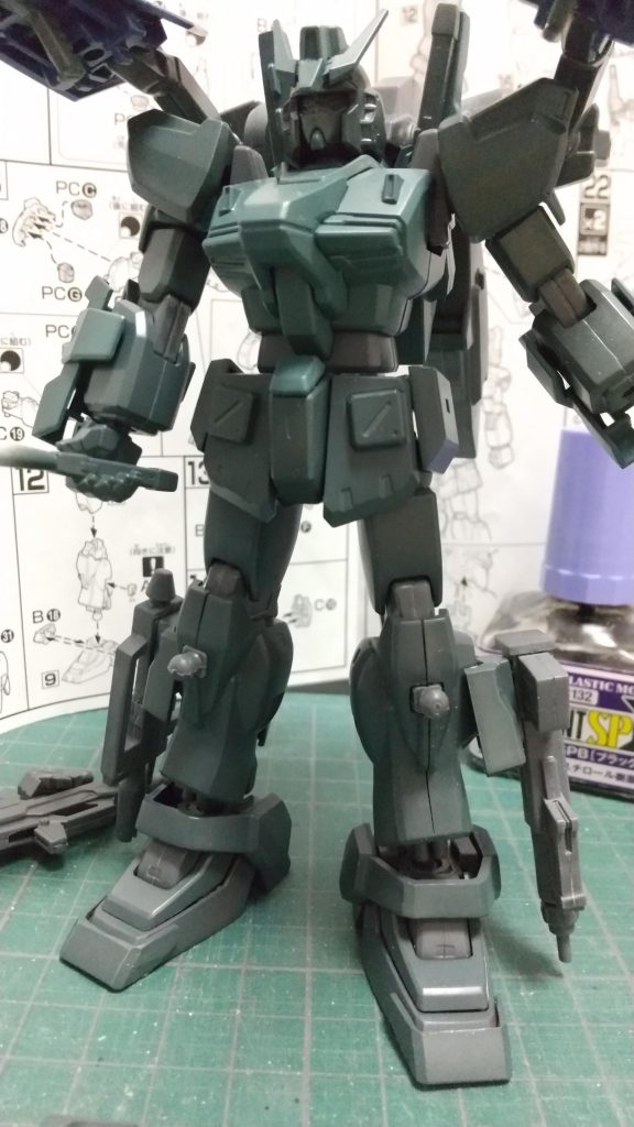 てな訳で、「多分GP01のライフル」を削って凹を作り、ランナーのタグを張り合わせて削って作った接続用パーツを付けて、脚に下げました。右脚には「多分スタークジェガンのライフル」を付けてます。