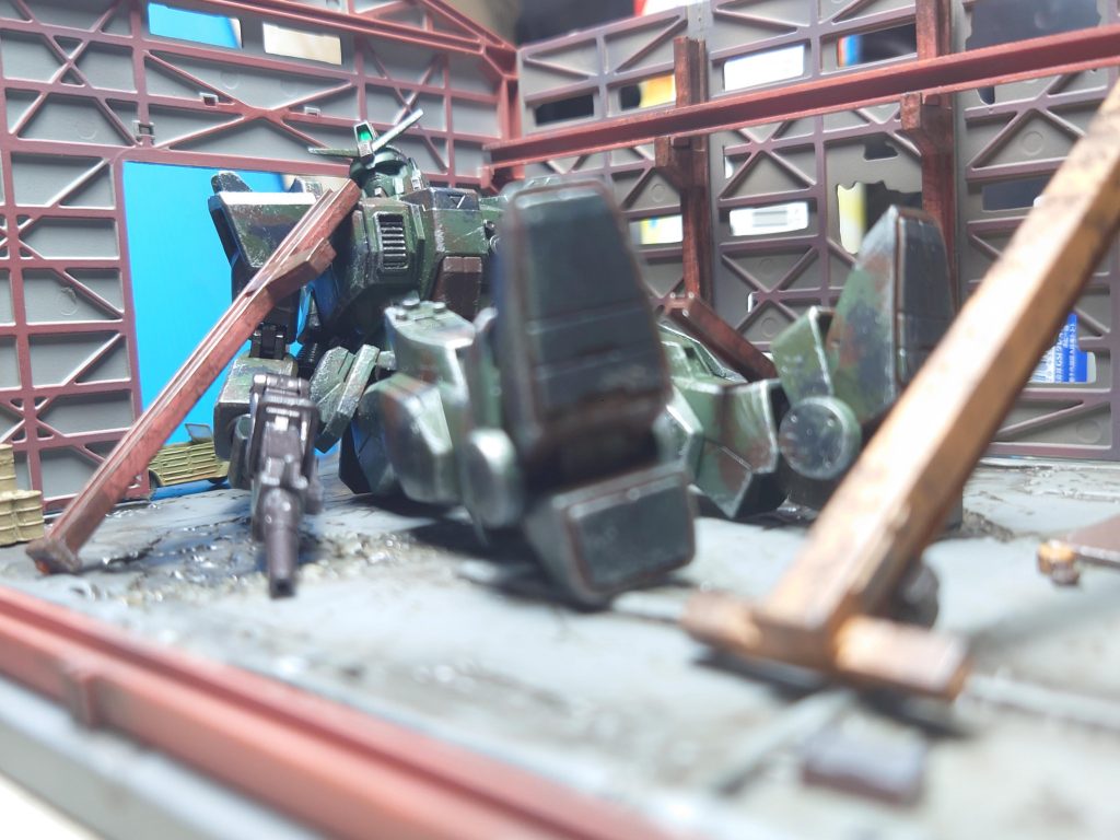 部屋の片隅に封印されていた箱には10年以上前に作った作品が多々あります。レストア待ちとして手元にありますが、今回は簡易ジオラマの主役として登場。筆塗り迷彩の陸戦Gは旧HGなので、ポージングが微妙。ジオラマということもあり、擱座風に配置。ジオラマキットはトミーテックのジオコレです。もとは1/150の鉄道模型用のはず。確か箱違いで鉄道模型コーナーにもありました。塗装済みで組み立てるだけのキットですが、ゲート処理、ライン処理、ウェザリング処理、と色々手を加えるとスケール感が増します。小物類は食玩戦車とそれこそ鉄道模型用の乗用車。これらも封印箱に入ってました。本格的なジオラマは技術も予算もないので厳しいですが、2〜3千円程度でこのクオリティなら買いですね♪