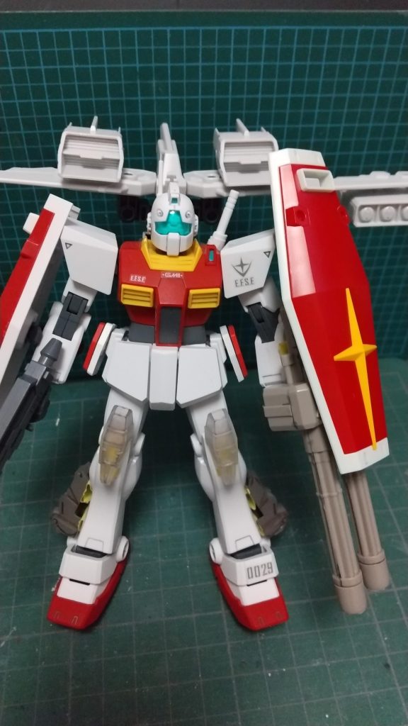 ジムⅡのTichiカスタムです。フライトユニット、ガトリングシールドと、あまりジムらしくない装備を追加してみました。これで進めようと思います。成形色の赤と白もカッコイイのですが、前二作と色合いを合わせて塗装します。