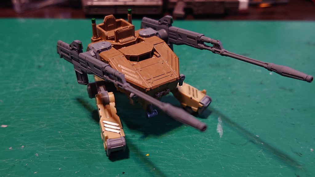 モビルワーカーは成形色だと色が足りなかったり、ライフルの色が違ったりしたので、ライフルと本体の一部をグレー、センサーのような部分をグリーン、窓と車輪をブラック、オルガ機にしたかったので、本体部分をクレオスの陸軍カーキで塗装しました。