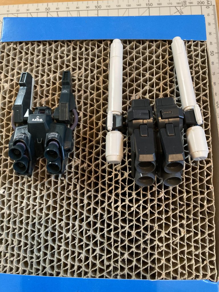 写真1 左側がガンダムMK-Ⅱのバックパック。右側がスペリオルガンダムのバックパック。スペリオルガンダムのビームキャノンをとり外して、エンジンを流用します。(バーニヤはヘイズルのバーニヤを加工して取り付けています。)