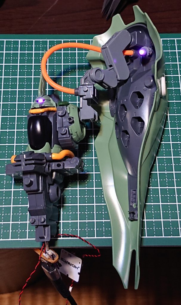 自分は成形色作製かつディテール追加スキルもないので、今回もハイキューパーツのLEDに頼って格好良くしたいと思い、モノアイとバインダーのバーニアの計9箇所を発光させることにします。