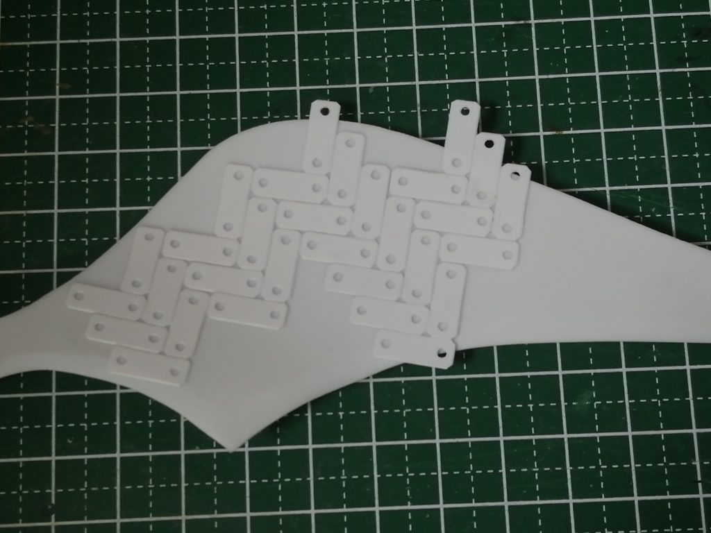ハンブラビの羽根にディテールが何もさすがに寂しいので、プラ板の小片をタイルのように貼り付けて誤魔化します。