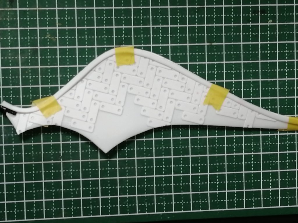 ハンブラビの羽根の上辺に貼るプラ板を切り出して、仮止めしてみました。