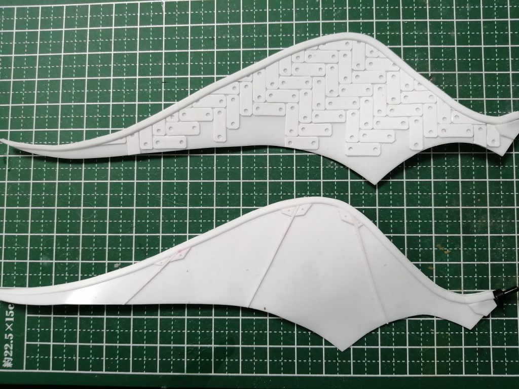 個人的な趣味は、前面の装甲類はディテール少なめ、後ろや隙間はディテール有りが好みなのですが、羽根はデカくて目立つのに、あまりにノッペリしているのはいかがなものかと思い逆にしています。