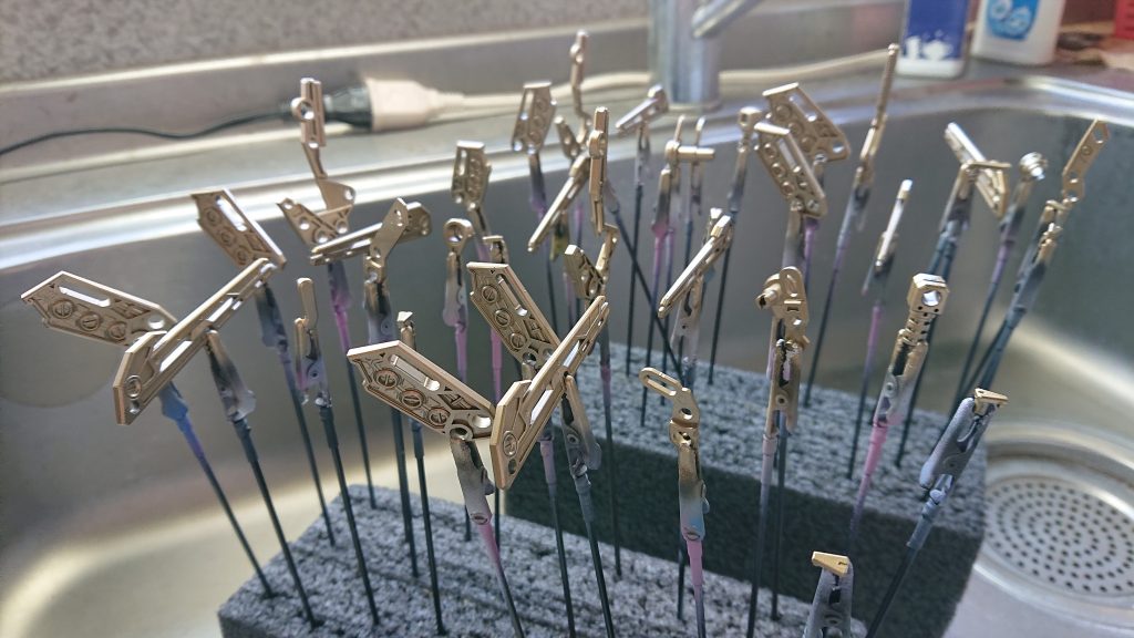 メッキパーツ剥離が終わったら、ゴールド塗装工程に入ります。