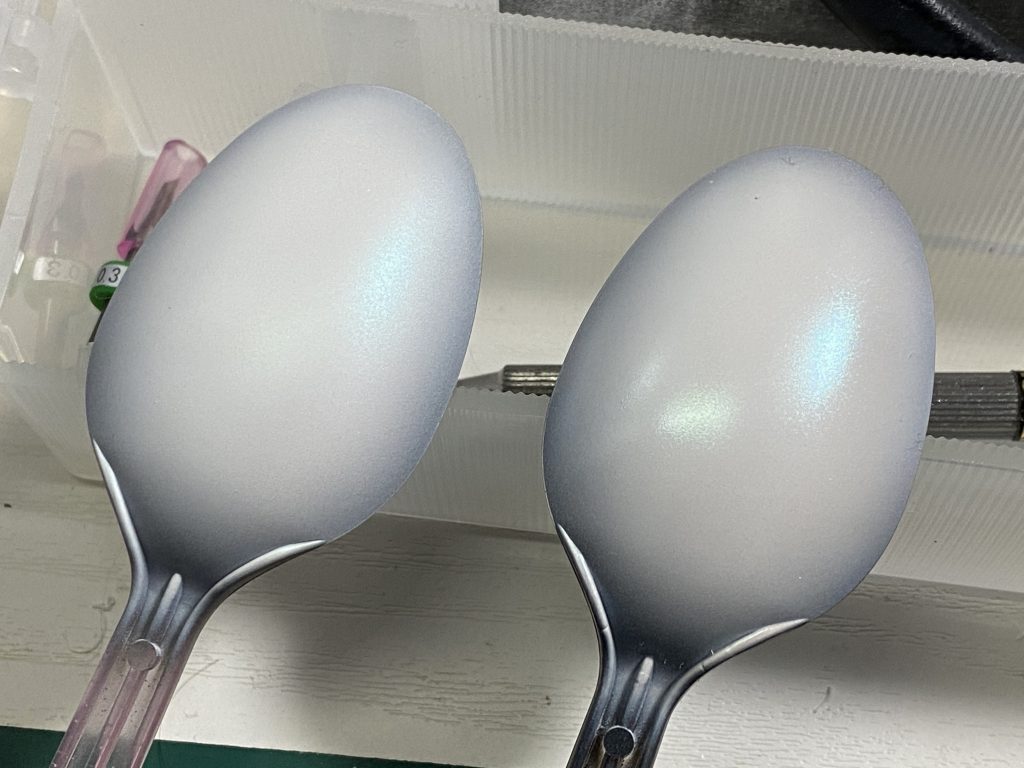 ウィノーブラックにクールホワイトを重ねた黒立ち上げにクレオスのクリスタルカラーターコイズグリーンを重ね。左側はスムースクリアでつや消し。右はガイアのクリアでつやあり。