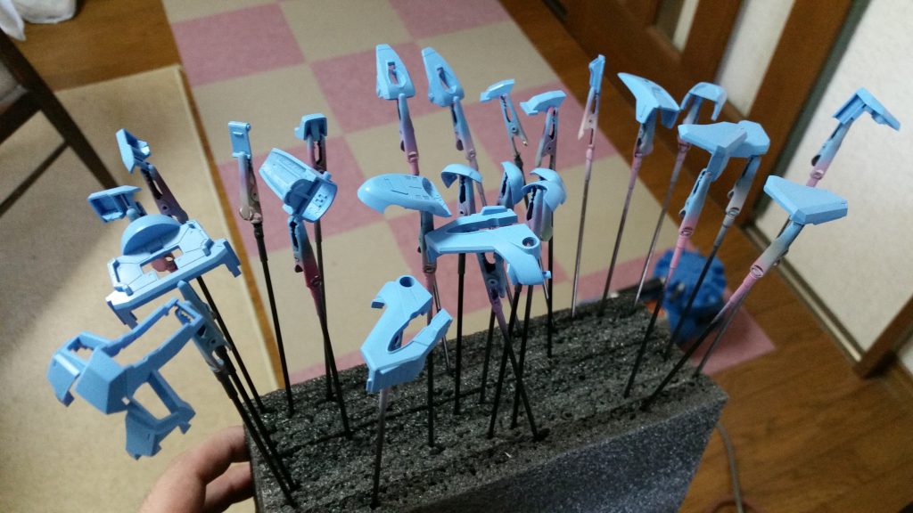 青パーツの塗装にはいります、青はサーフェイサーの代わりに下地塗装としてフィニッシャーズのファンデーションブルーを吹いて青の色をしっかり出す方向でいきます。