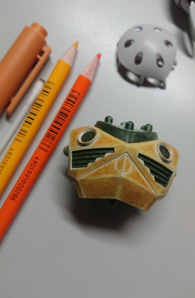 タミヤカラースプレーマットホワイト⇒スーパークリアつや消し⇒トンボ山吹色⇒トンボオレンジ色⇒ガンマムマーカーリアルタッチイエロー1を重ねて綿棒で伸ばしていくと上記の焼き色が出来上がります。