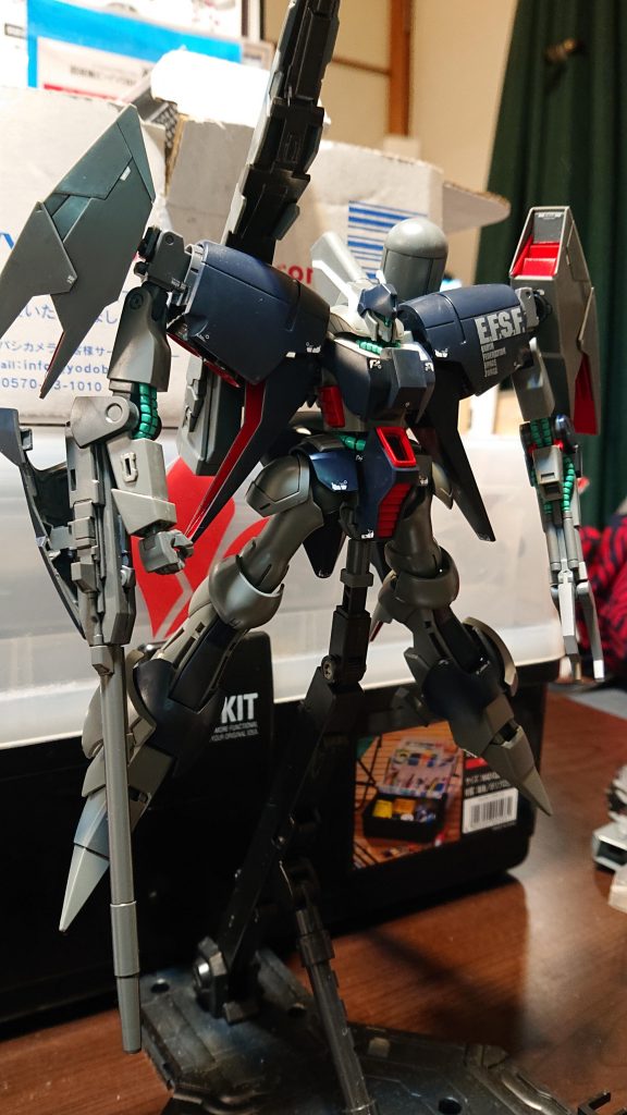 カラーはUCMSVの設定画や漫画の表紙に基づいて、スラスター噴射口付近のレッドの他、動力パイプをエメラルドグリーンに塗りました。