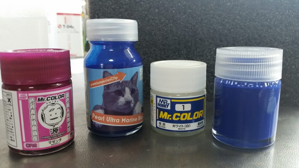 本塗装はガイアカラーのウルトラマリンブルーにクレオスのホワイトとマゼンタを調色したものを使います。