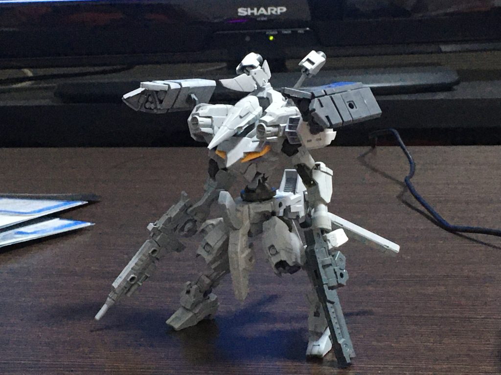 30mmとガンプラのミキシングで、もしGBNで30mmを使って良いなら自分はこう言うシルエットの機体を使いたいと妄想しながら作っています。コンセプトは高機動、空中戦、中距離。