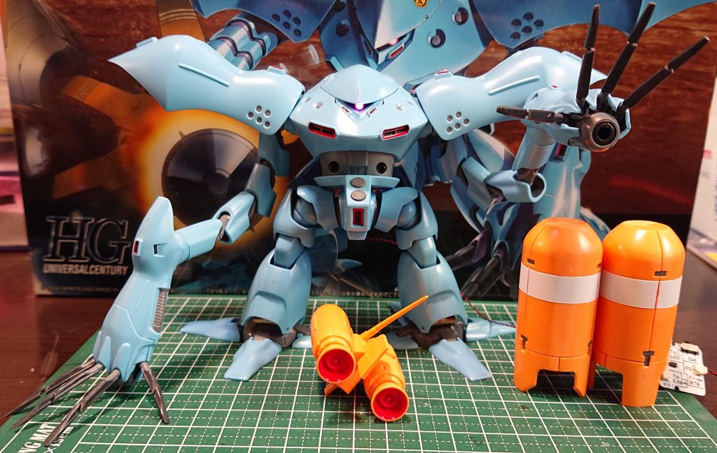 塗装箇所は全てクレオスの塗料で足関節の一部をゴールド、背面バーニアの外側と腕部ビーム・カノンを黒鉄色、フェアリングユニットのラインとジェットパックのサーチライト部をホワイト、各ダクト部やバーニアの内側の縁をレッド、中心をブラック、後はバイス・クローの根本、足の裏、フェアリングユニットの一部、装甲の丸いモールドや装甲内側をグレーで塗装しました。