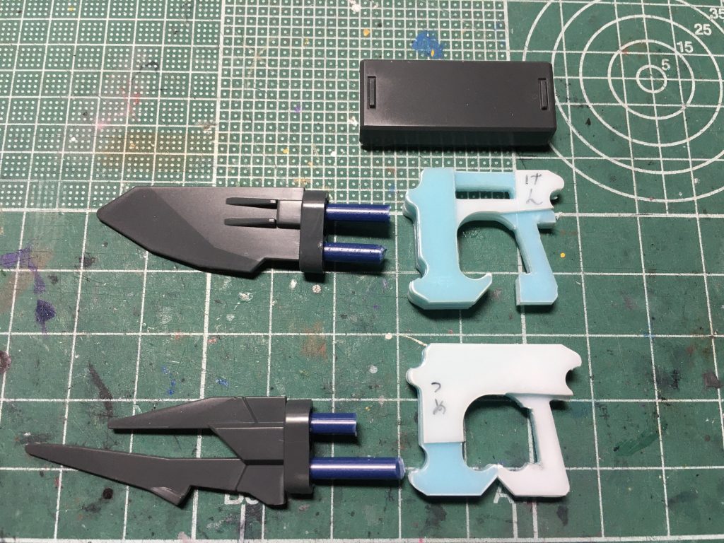 まずクロー型、剣型のグリップの形を作っていきました。剣型は上に別の持ち方ができるようグリップをこしらえ、ボールデンの装甲板を追加予定。