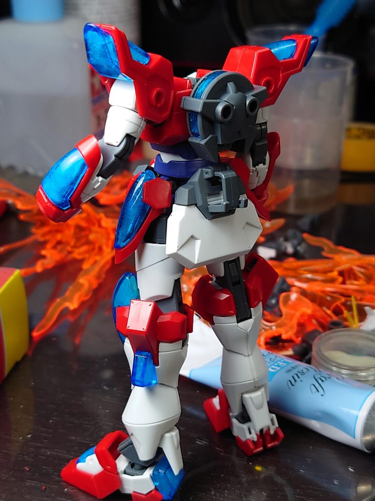 一通りのレジン固めが完了。あとは、パーツとの干渉やハマり具合の調整です。しかし、このレジンは便利ですね〜 UVライトを照射しないかぎり硬化しないし、約60秒くらいか未満でもライトの光を当てれば硬化してくれます。重宝しそうですが、まぁここまでクリアーパーツを使うガンプラをこれから作るかはわからないですが。ガンカメラやアイレンズにちょっと使うことは、ありそうかなー