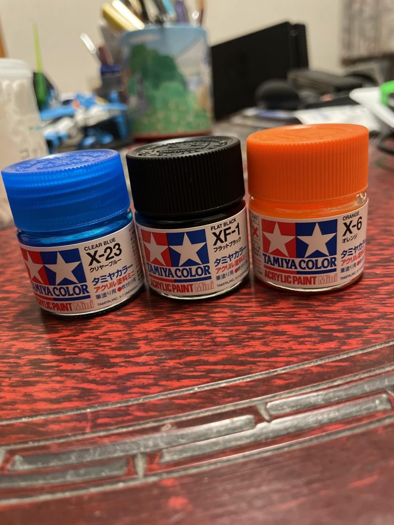 初心者なので、クリヤーブルーとオレンジ、それからブラックのアクリル塗料ミニを購入し筆塗り練習開始!!