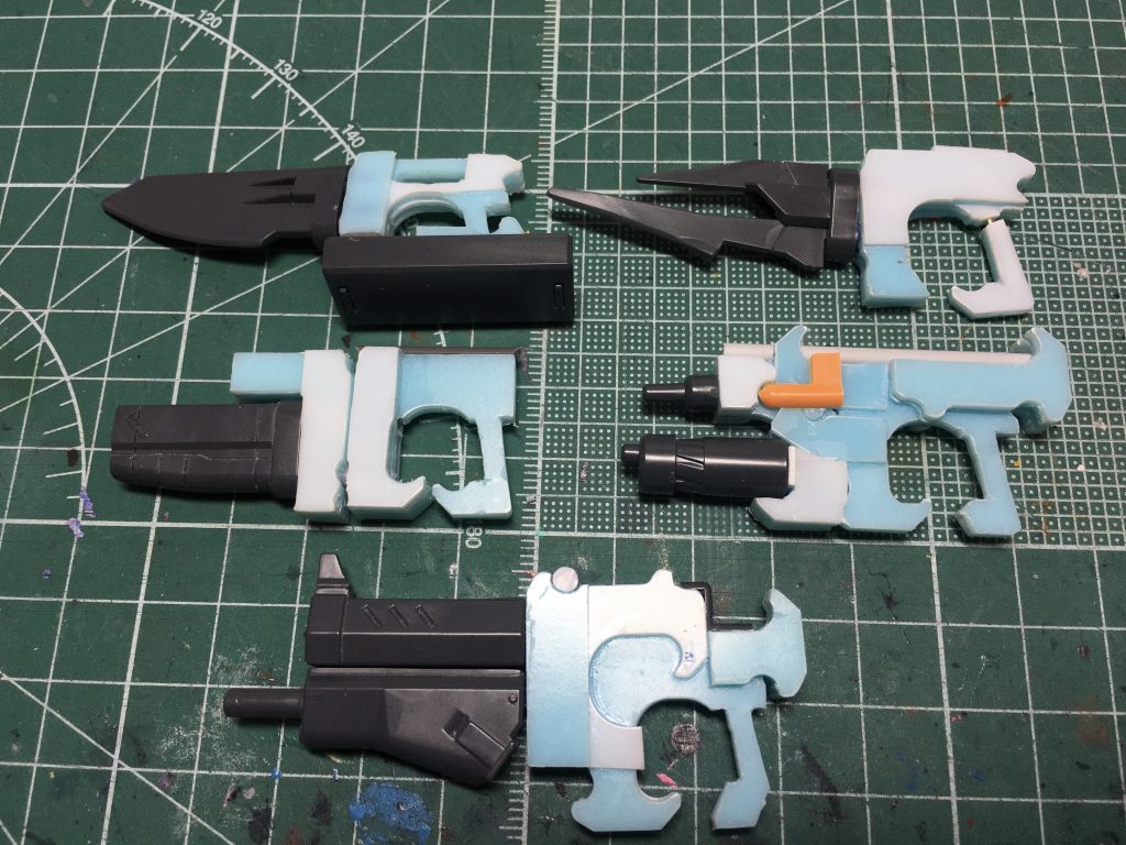 食パンのクリップで作ったグリップ達、大まかな形状出し自体は終わったのでヤスリがけを行いました。以前ゼットコン向けに出したヘイズル改でも使用したミネシマのクラフトヤスリでサクサク削って大まかに形状出しができたので大助かりでした。
