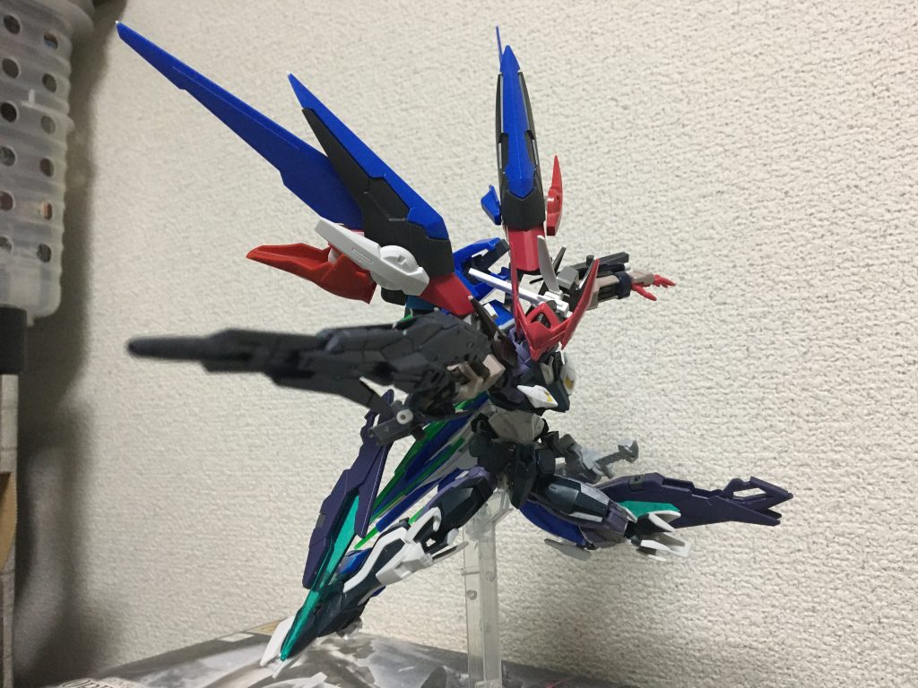背中のブースターの上部パーチの位置を調整。もう少し大きく開いて派手にしたいなぁと改めて思いまして、わざわざ積んでたダークマターブースターを出して調整しました。上部のパーツを少しだけ上に位置を置いたので元トランザムブレイドと上部パーツが可動出来る様になりました。地味な調整ですが結構変わったのではないでしょうか?