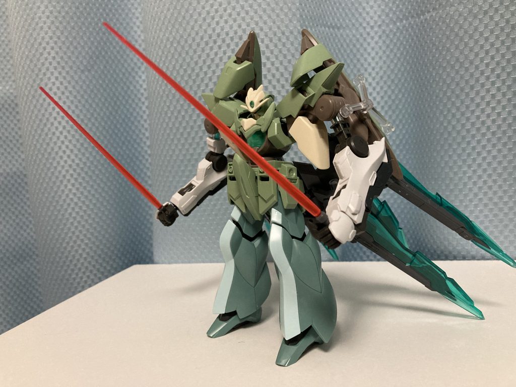 GNバスターソードXを翼のように展開させるギミックでずっと躓いていましたが、GNファング80個制作のために購入したマギアブレードで大量に余った軸パーツ等を上手く使って、問題を克服しました。腕は大型の武装を持たせる時の保持力確保のために大型に変更。肩はGN-X系の脚部パーツをほぼそのまま流用。なんかいけるんじゃね?って思ってやったら若干バイアランっぽく見えてOKサイン出しました笑。更に腕部の可動域の確保のため、胸部と腕部の接合部を拡張。そのため本体の脚部をどうするかでまた躓き、結果バランスを考えてヴェイガンのバクトの脚部をそのまま取り付けました。まぁしっかり改造するんですけど。見た目は結構気に入ったんですが、ちょっと脚部の可動域が狭いんですよ。頭部と胸部と腰部に関してはまだ決まってないんですよね、嗚呼どうしようどうしよう