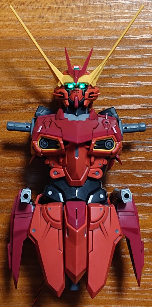 今回も電飾を行っていますが、前回は目のパーツと隈取のパーツの隙間から光が漏れていたため、光が漏れなくなるまで、何度も隙間の部分にブラックの塗料を重ね塗りして遮光しました。