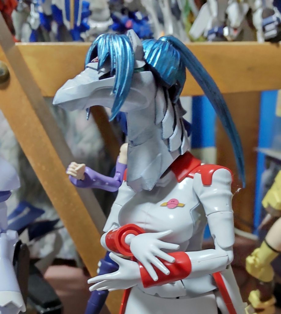 元々は黒髪ロングポニーテールなのですが、ガンダムマーカーのメタリックブルーで塗り塗りしました。
