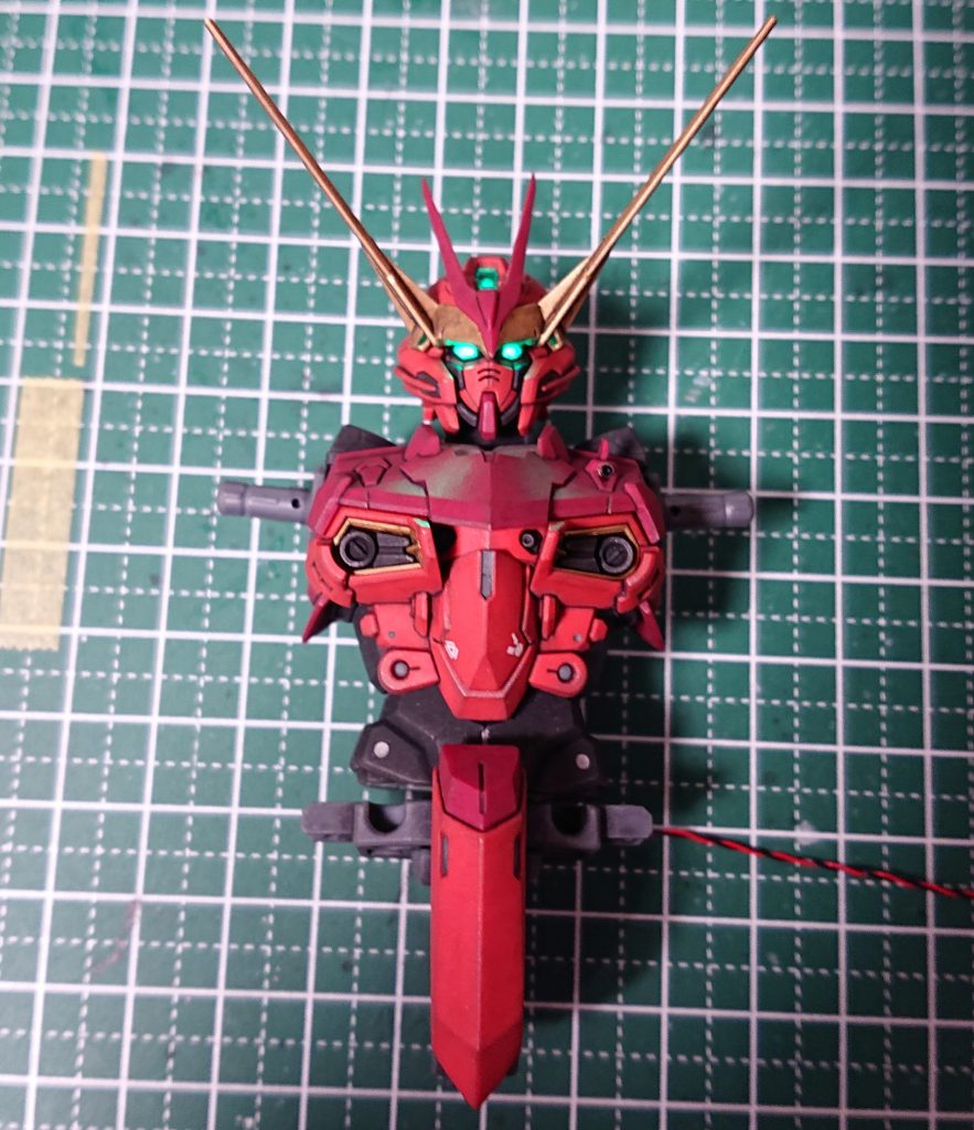水転写デカールの貼付が終わり、つや消しスプレーを吹きつつ、吹き終わったパーツからウェザリングを行っていますが、先にLEDを通す頭から腰の部分を仕上げました。