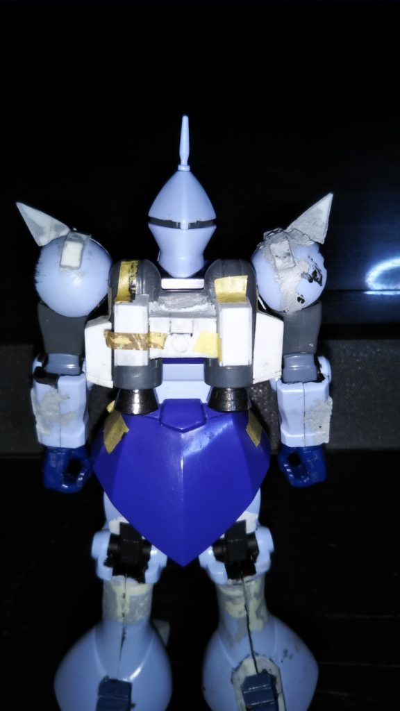 旧HGUCのギャンのバックパックは、なぜか背中から浮いた状態で取り付けるような形になってきたので、背中側のダボを少し削って背中にピッタリとフィットするようにしてやりました。