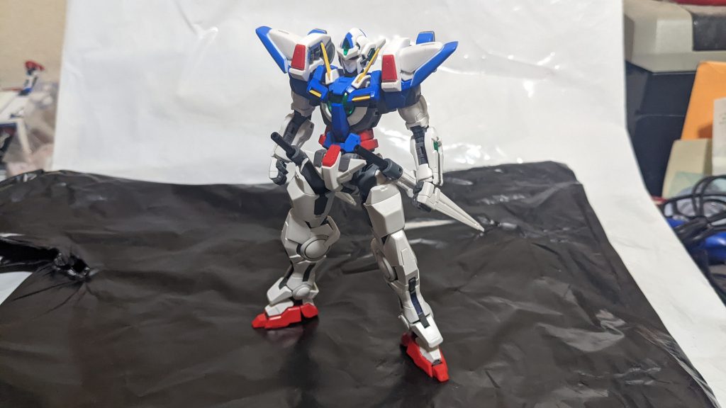 前回に比べるとGNソードⅡの刀身に30MMオプションパーツに入っていた汎用ジョイントをくっつけただけの簡単仕様ですが、どちらからでも引き抜けて前後関係なく構えられるので概ね満足。接続穴は1.7mmドリルで穴を開けて、エクシア股関節のジョイントに取り付けています。(前回1.8mmと記載しましたが、少し抜けやすく自重で傾きやすかったので2mmに拡張→2mmプラ棒で穴埋め→1.7mmの穴に修正しました)