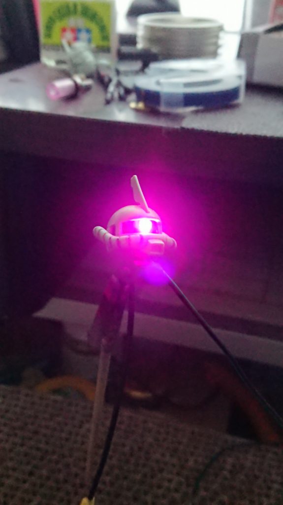 外部からの無線電波が必要になりますが、最近はワイヤレスの小型LEDも出ましたね。モノアイ用でもいいから1/144対応のものをバンダイさんにがんばって商品化してほしいものです。