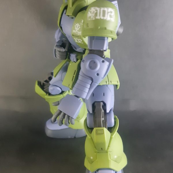 わずかですが一部スジボリとプラ版によるディテールアップの練習、肩のグフ角をMSスパイクに、頭の角も無駄に前傾姿勢、肘関節をグフから移植して可動域を増やし、足まわり(またか!)をいじって接地性をあげてみたんですが・・・
